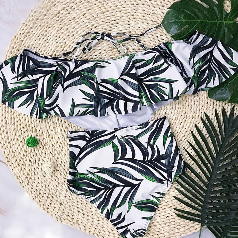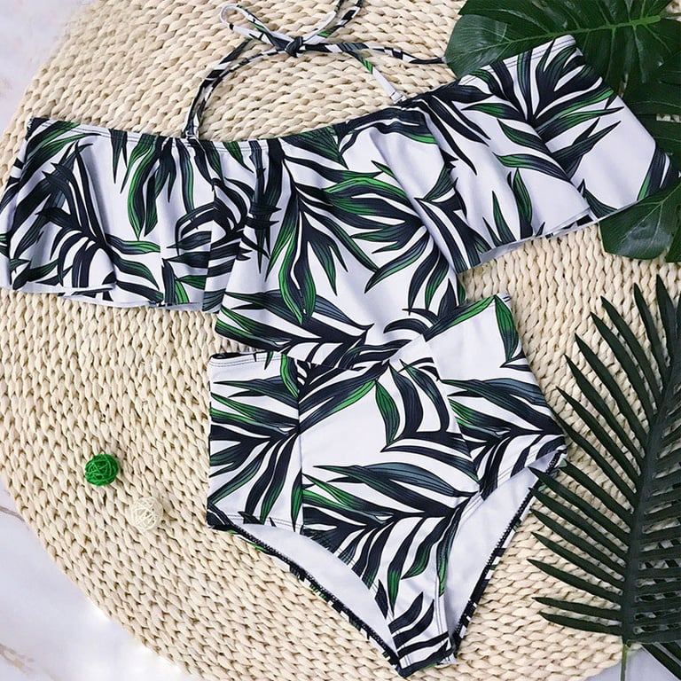 Women's two-piece swimsuit with a colourful pattern. The top features sleeves and a ruffle. The bottom has a high waist. Available in multiple variants.