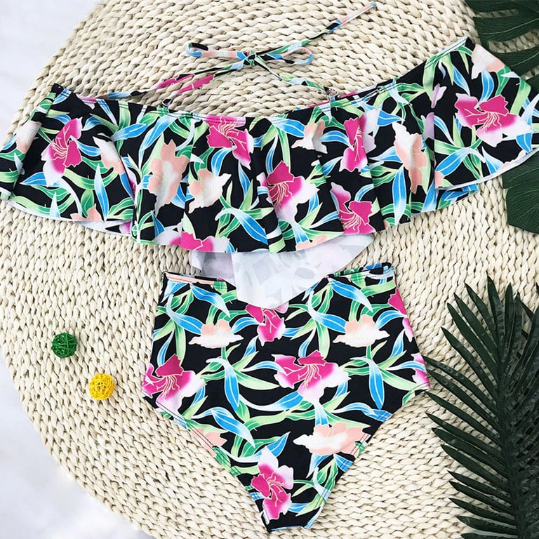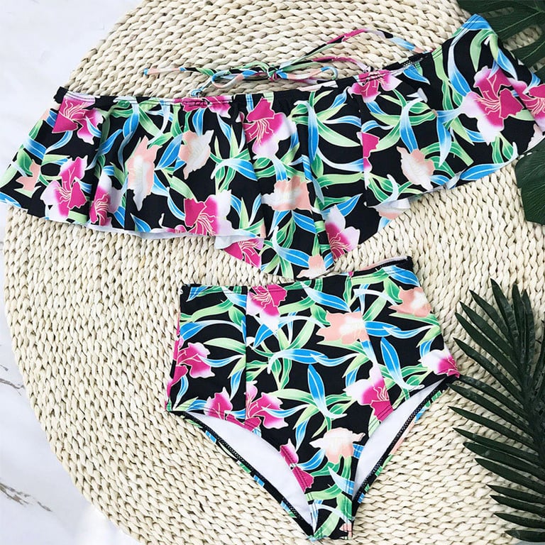 Women's two-piece swimsuit with a colourful pattern. The top features sleeves and ruffles. The bottom has a high waist. Available in multiple variants.