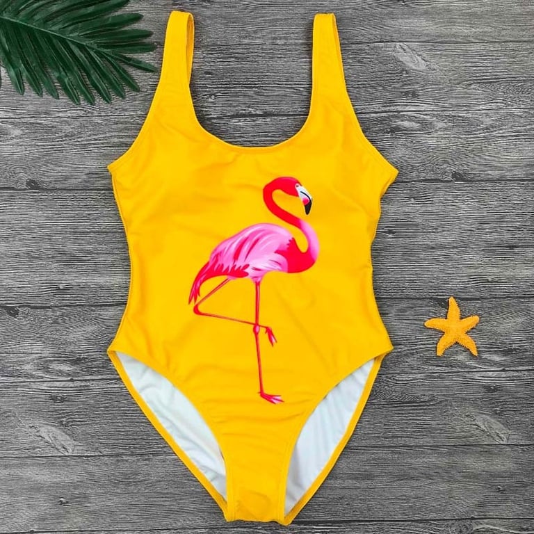 Fashion swimwear featuring a flamingo motif, which has been so popular in recent seasons. The one-piece swimsuit has its charm; which colour suits you best?