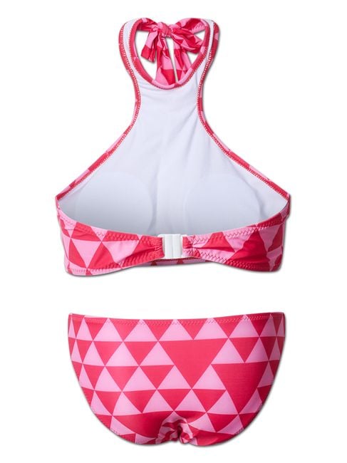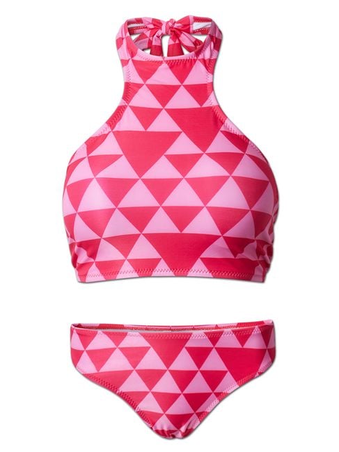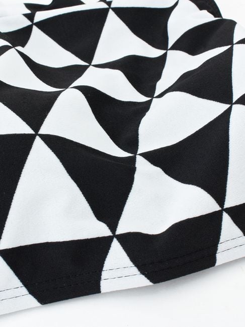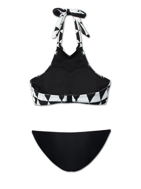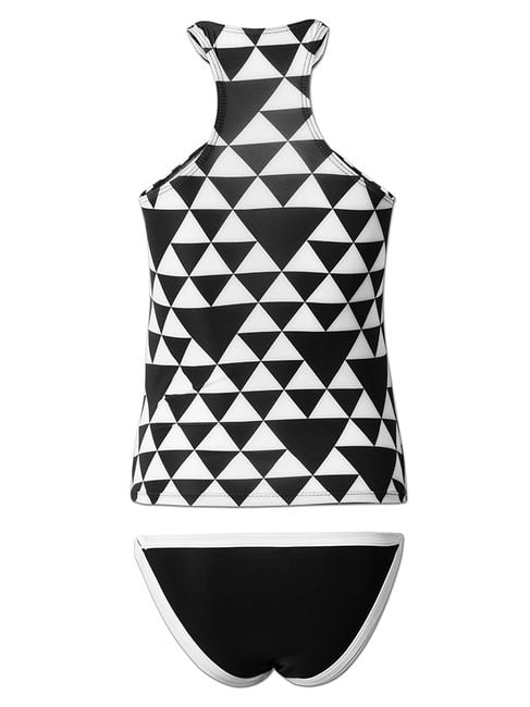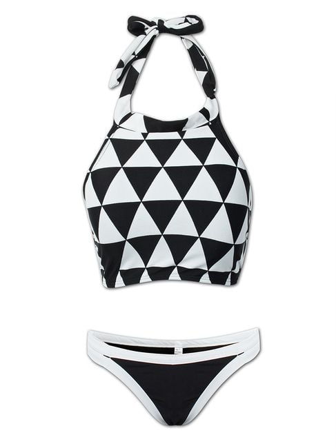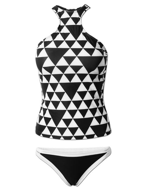 The diamond print is suitable for women who need to accentuate the upper half of their body. The longer top also allows for hiding or visually reducing the tummy area.