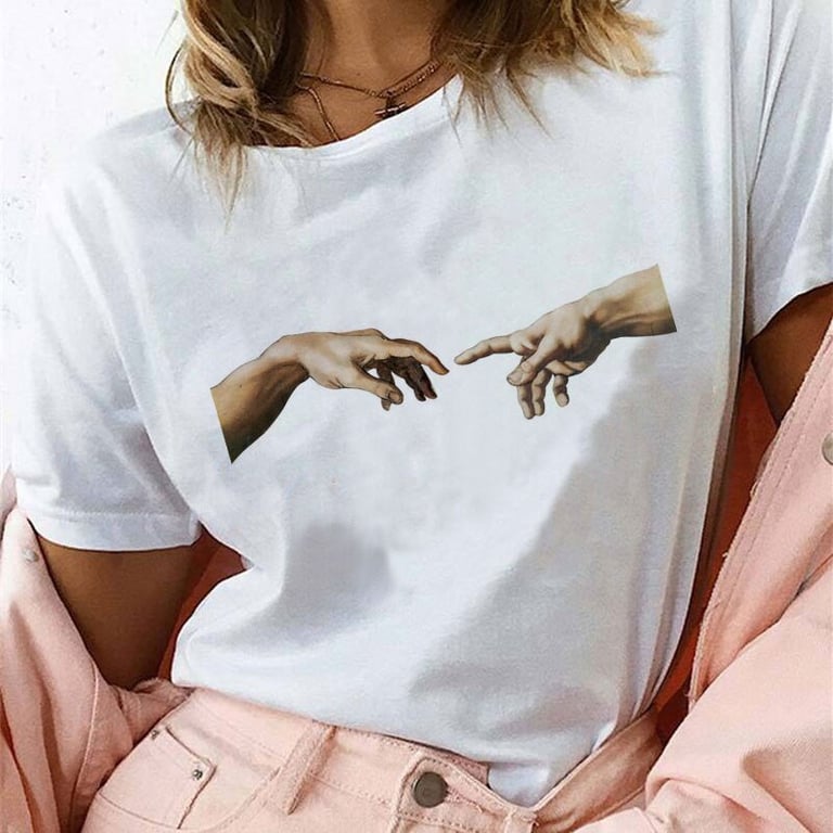 Women's t-shirt with a colourful print on the front. The t-shirt has a loose straight cut, short sleeves, and a round neckline.