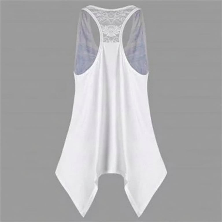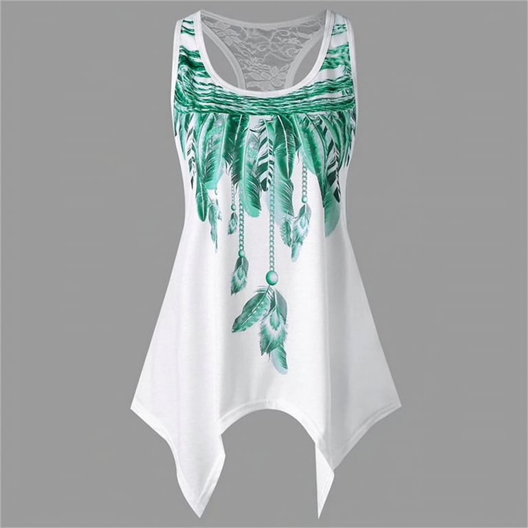 Women's sleeveless top with wide straps. The back features a lace neckline and the front has a colourful print with feathers. Asymmetrical loose fit. Plus size options available. Several variants to choose from.