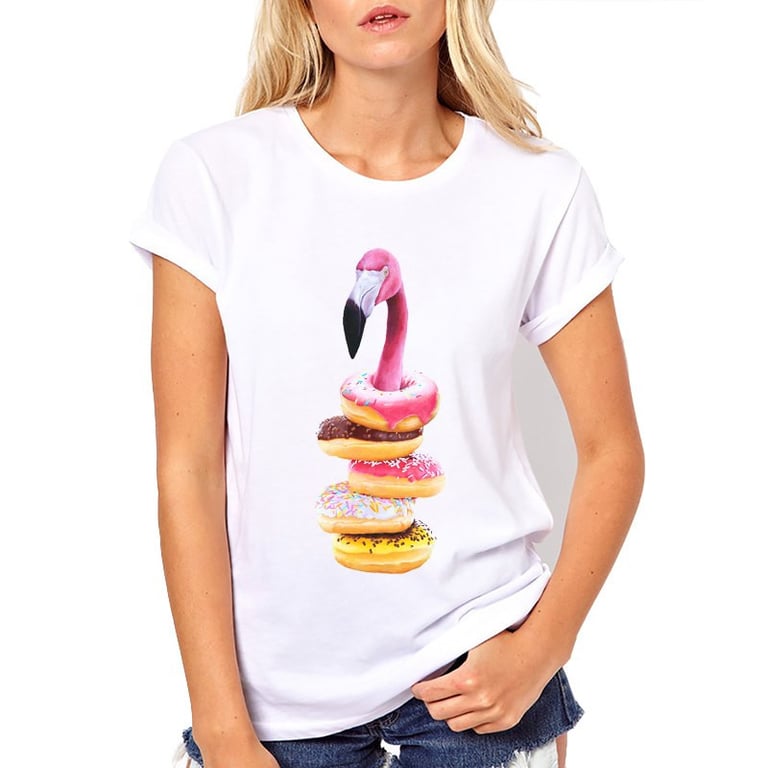 Women's loose-fitting t-shirt with short sleeves and a round neckline. The t-shirt features an original colourful print of flamingos and donuts.