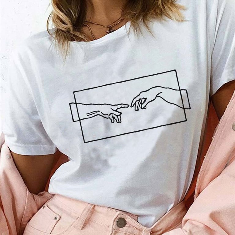 Women's t-shirt with a colourful print on the front. The t-shirt has a loose straight cut, short sleeves, and a round neckline.