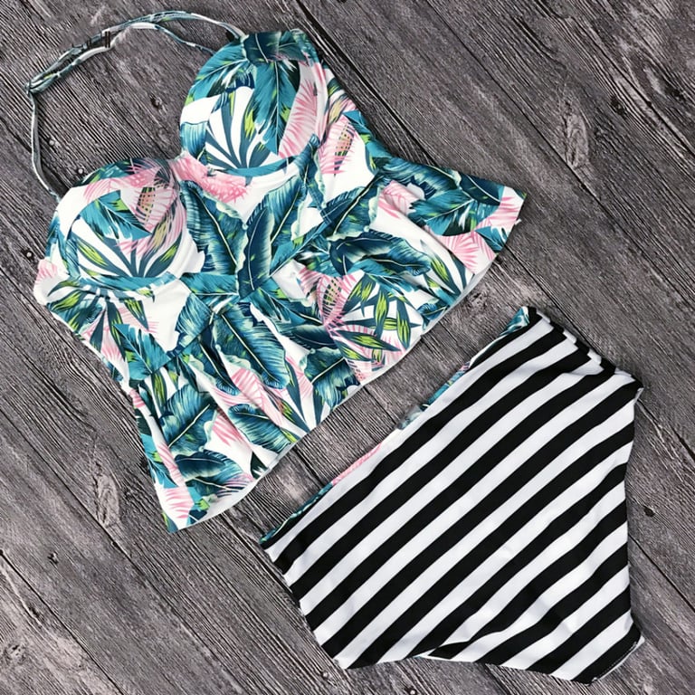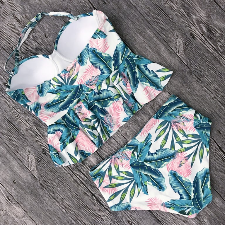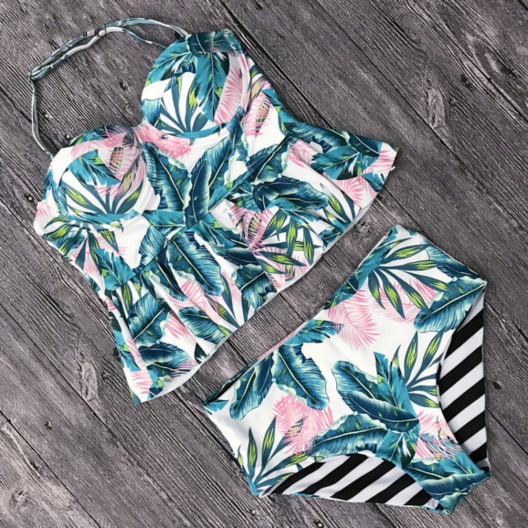 Women's tankini swimwear with a summer print. Top with narrow straps and ruffles. Bottom with a high waist, reversible.