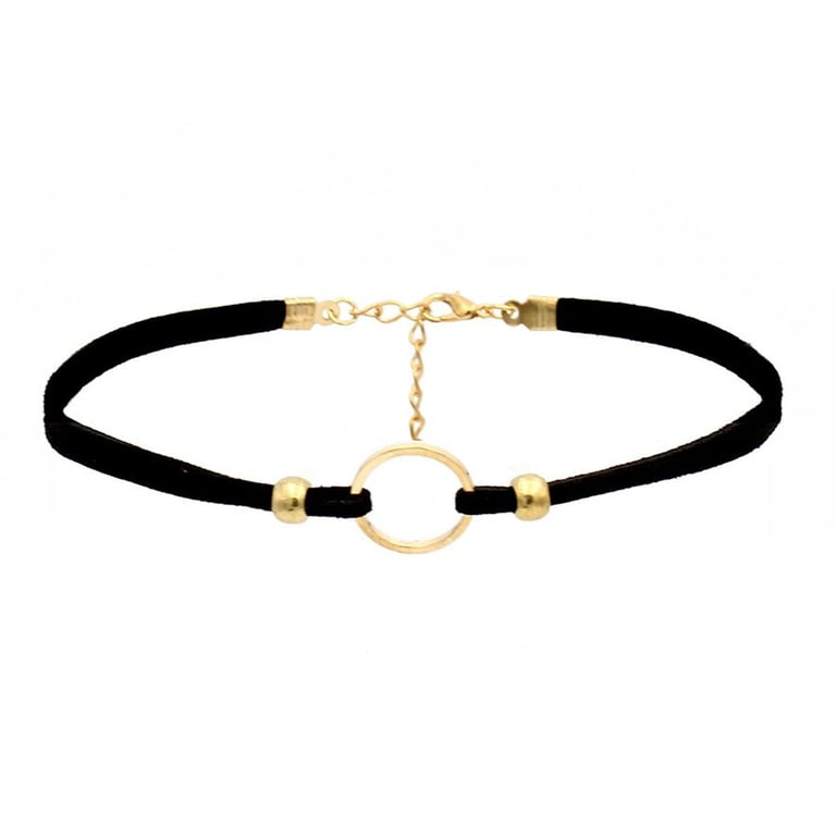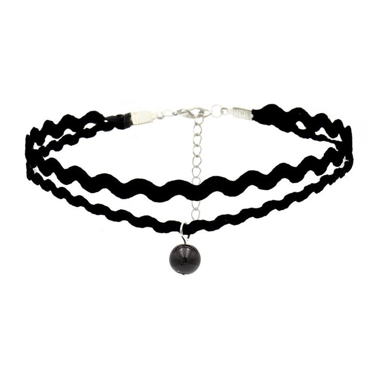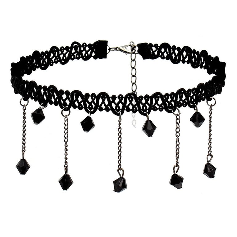 A very stylish necklace for young ladies. The necklace is in a choker style and features black stones hanging from it.