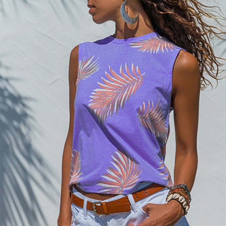 Women's sleeveless top. Loose straight cut with wide straps. Colourful print featuring leaf motifs. Available in multiple variants.