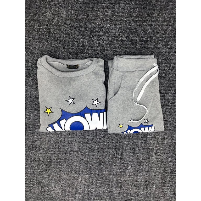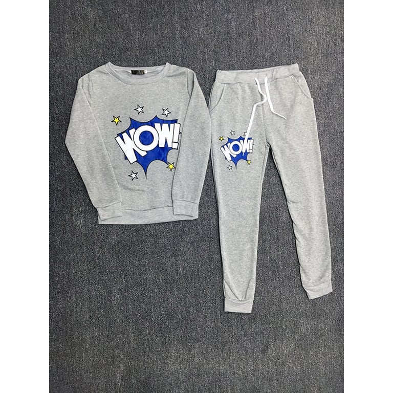 Women's tracksuit set consisting of a hoodie and trousers with a colourful print. The hoodie has a round neckline and the trousers have elasticated legs and can be tightened at the waist with a drawstring.