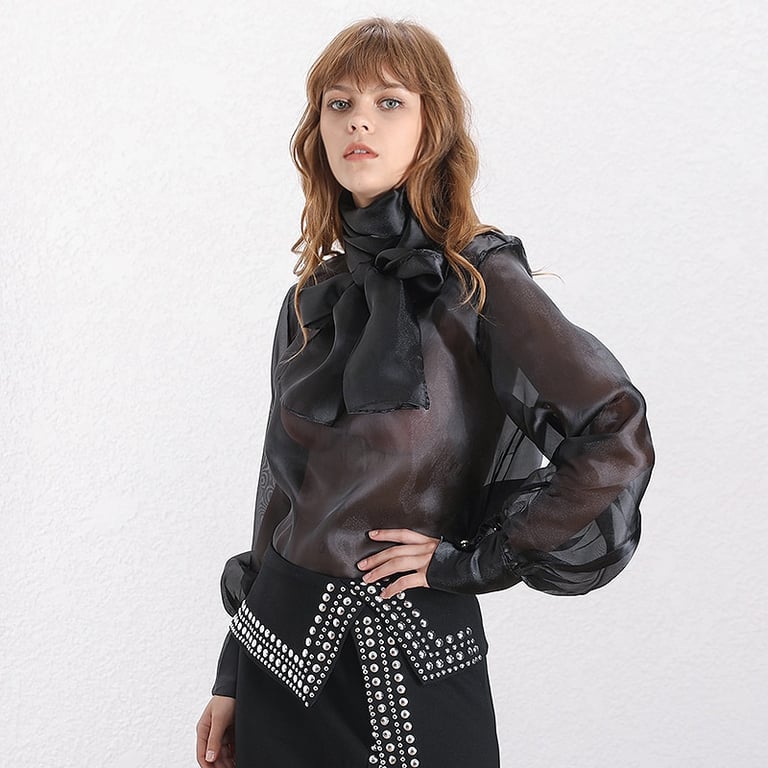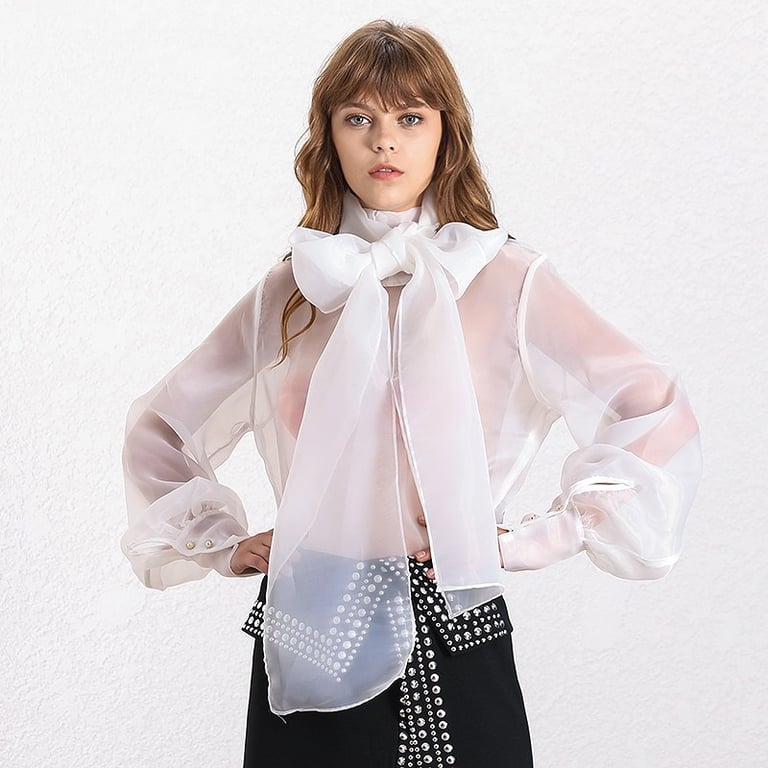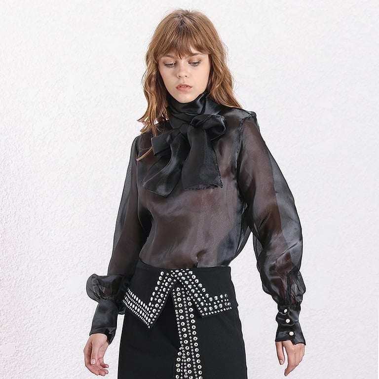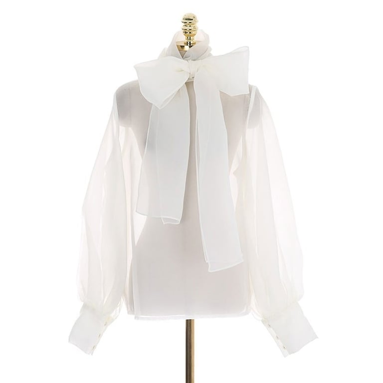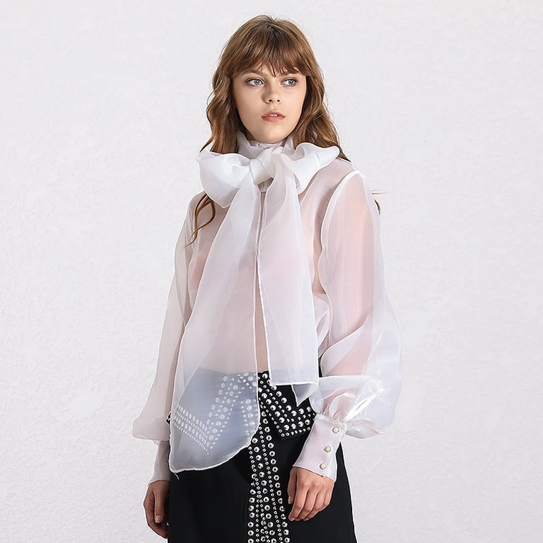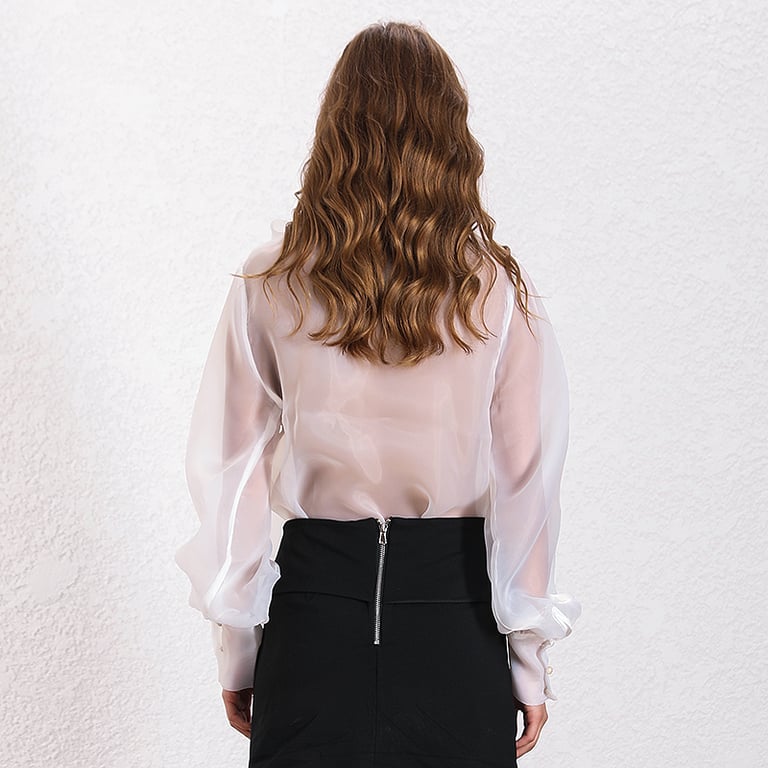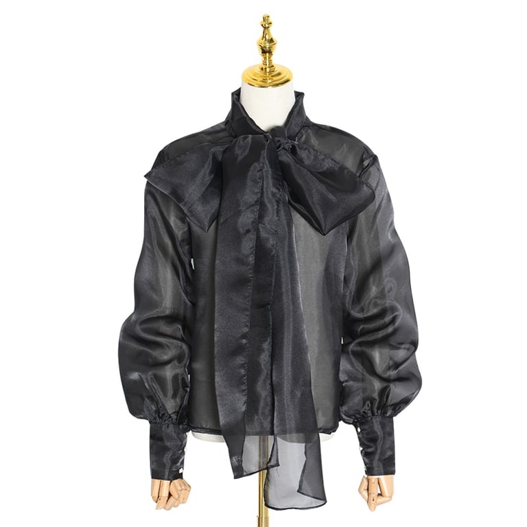 It is completely transparent, including the sleeves. It is adorned with a large bow.