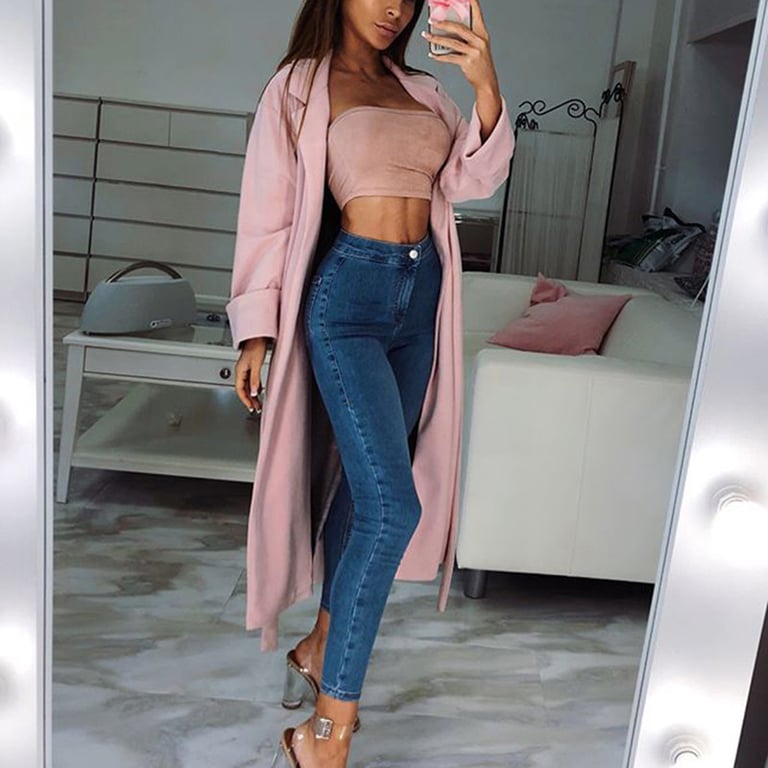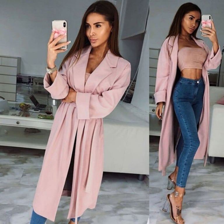 Women's stylish trench coat in pink. Lightweight. Wrap-around with a tie belt at the waist. Lapel collar.