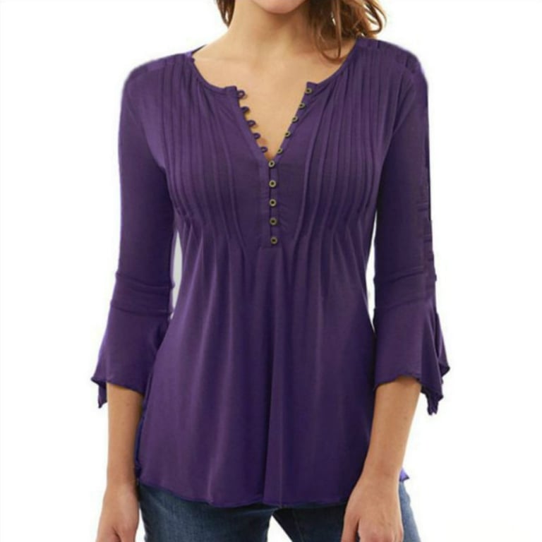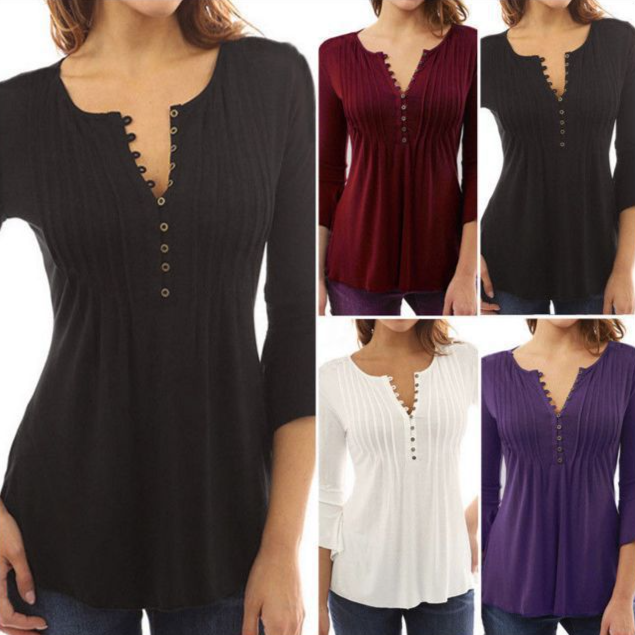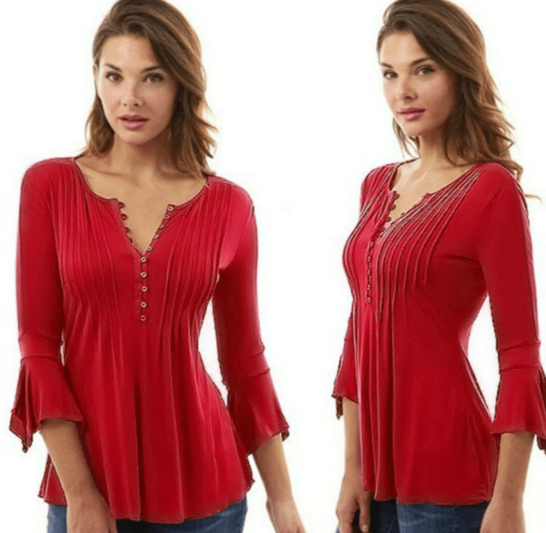 • With 3/4 decorative sleeves, V-neckline with buttons and gathered detail on the bust.