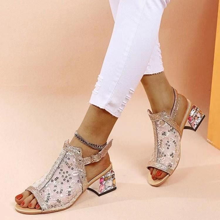 Women's translucent lace shoes with low heels adorned with rhinestones.