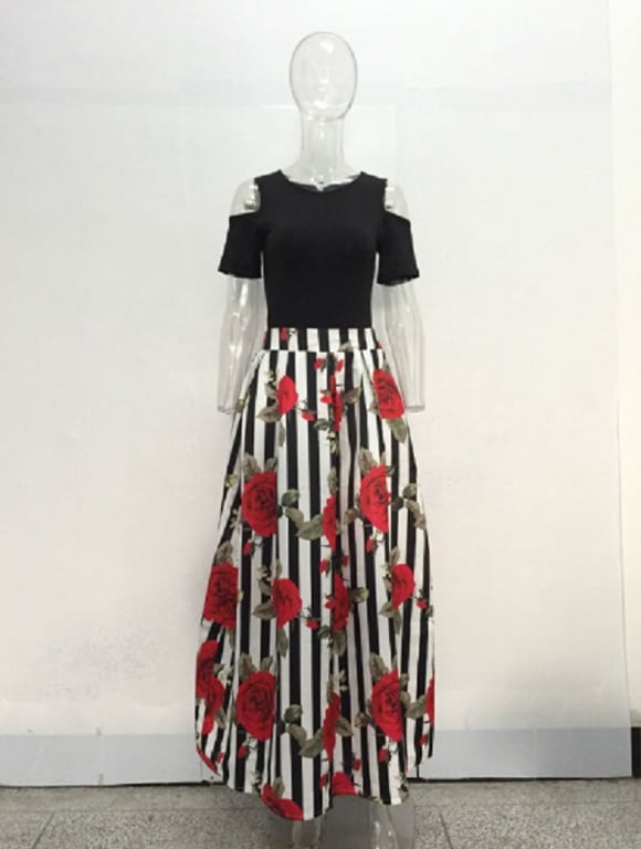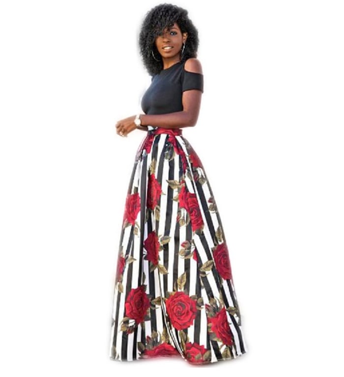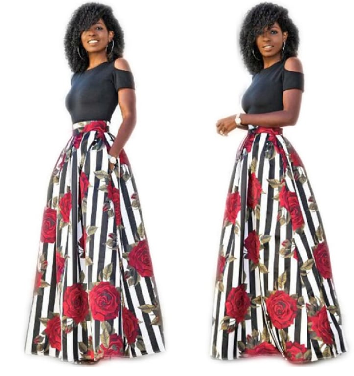The first is a black top with shoulder cut-outs and the second is a long floral skirt.