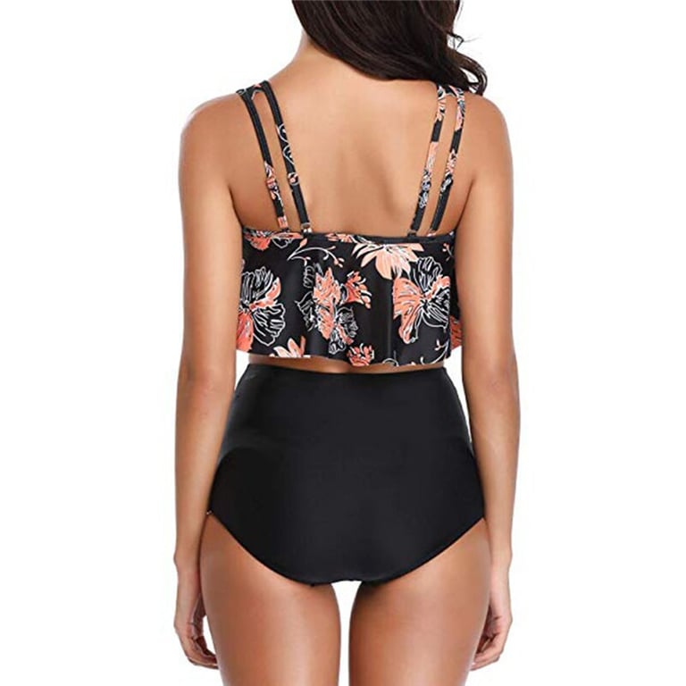 Women's two-piece swimsuit. The bottom part has a high waist. The top part features adjustable straps and a ruffled neckline. Available in multiple variants.