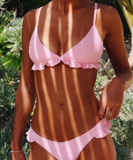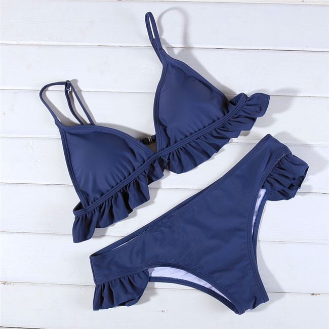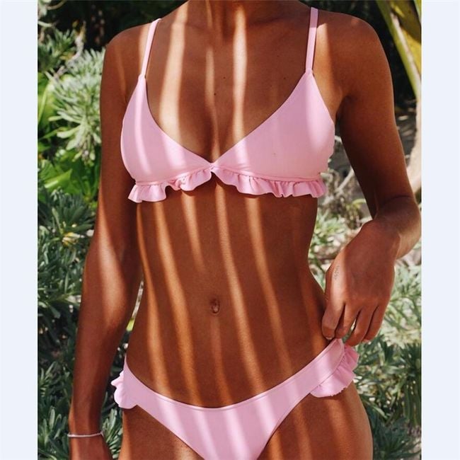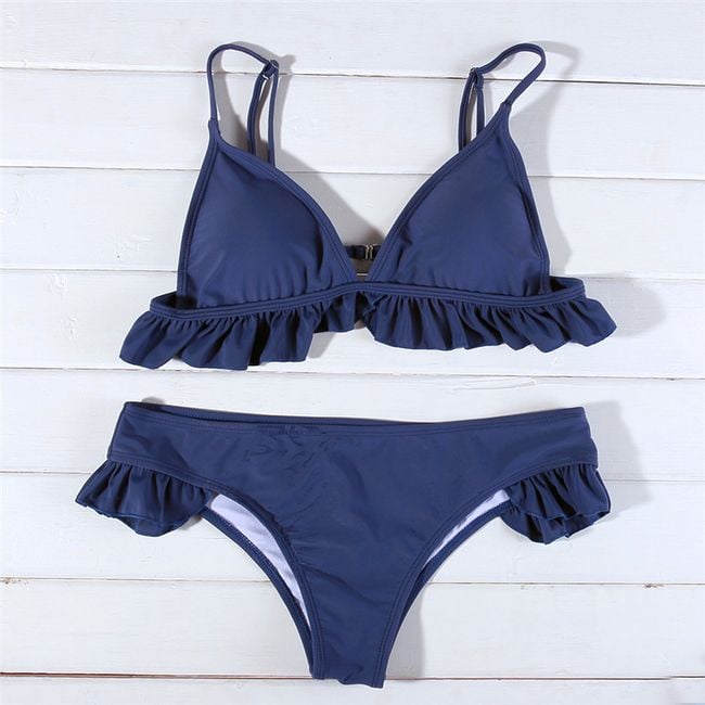 The swimsuit features beautiful smaller ruffles on both the top and bottom parts.