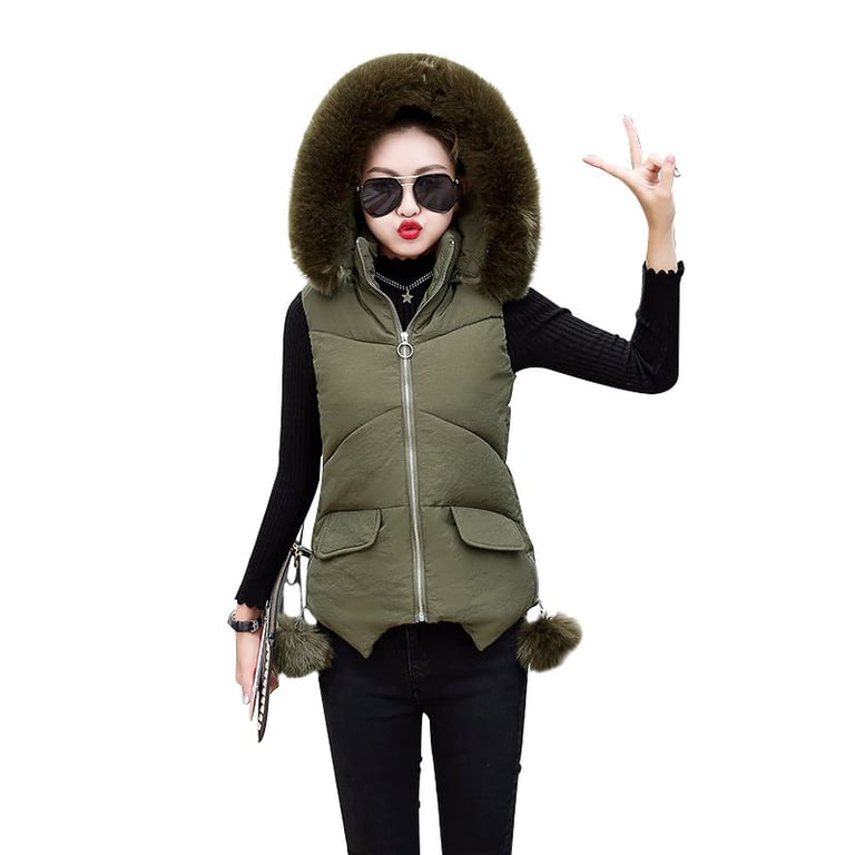 Women's insulated vest with pom-poms and fur. Available in multiple colour options.