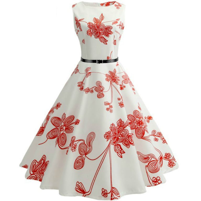 Women's vintage style dress with a belt. The dress features a wide A-line skirt. Sleeveless with wide straps and a round neckline. Colourful print. Available in multiple variants.
