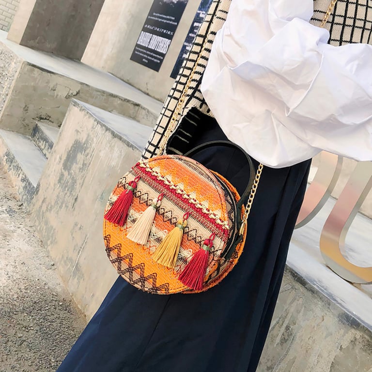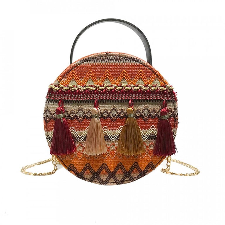 Women's vintage style handbag. The handbag features embroidery and decorative fringes. Chain strap. Zip fastening. Available in two variants.
