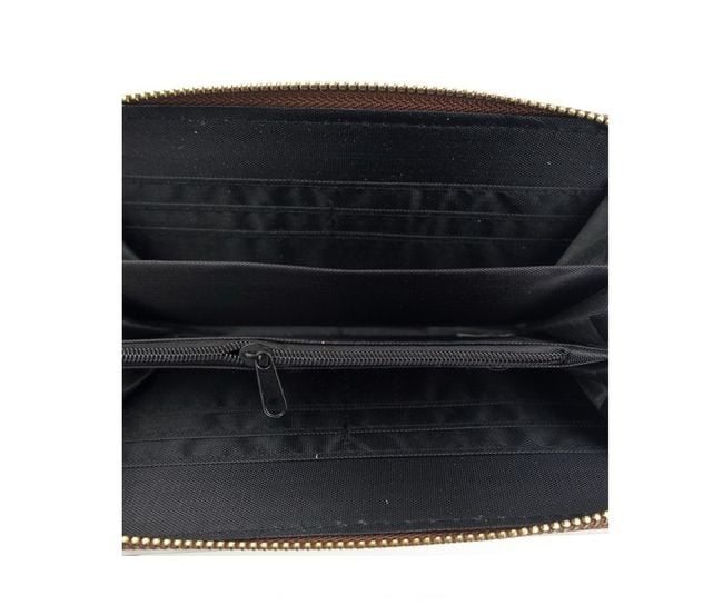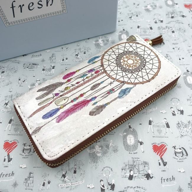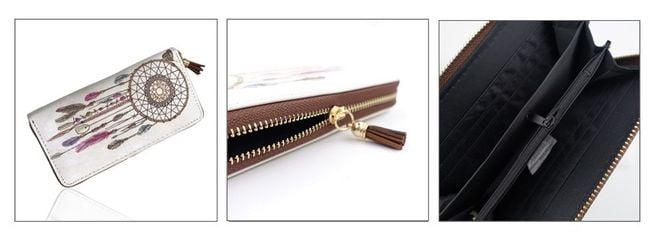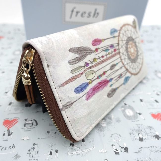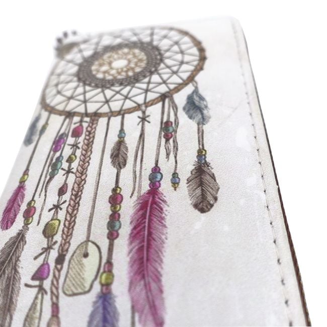 Women's wallet with imaginative abstract motifs of dream catchers and feathers in pleasant colours. The wallet is very spacious and can accommodate some types of iPhones. Inside, you will find a zippered pocket, compartments for paper banknotes, and slots for payment cards. A beautiful fashionable and practical accessory for every woman.