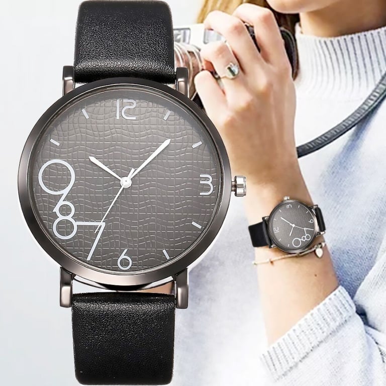 Women's watch with a leather strap. Dial with numbering in a metal frame.