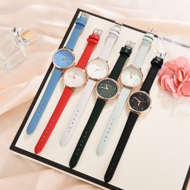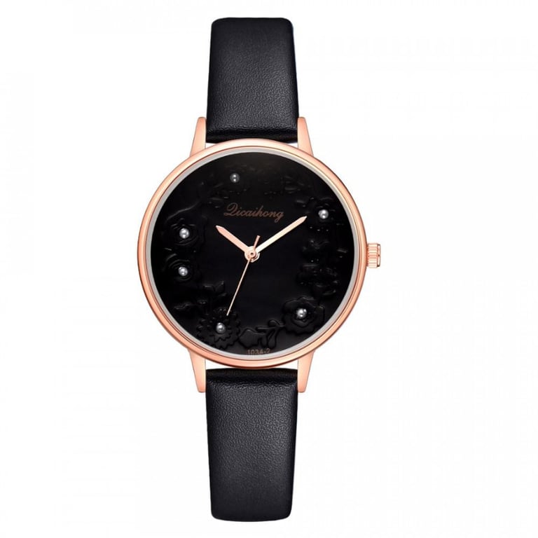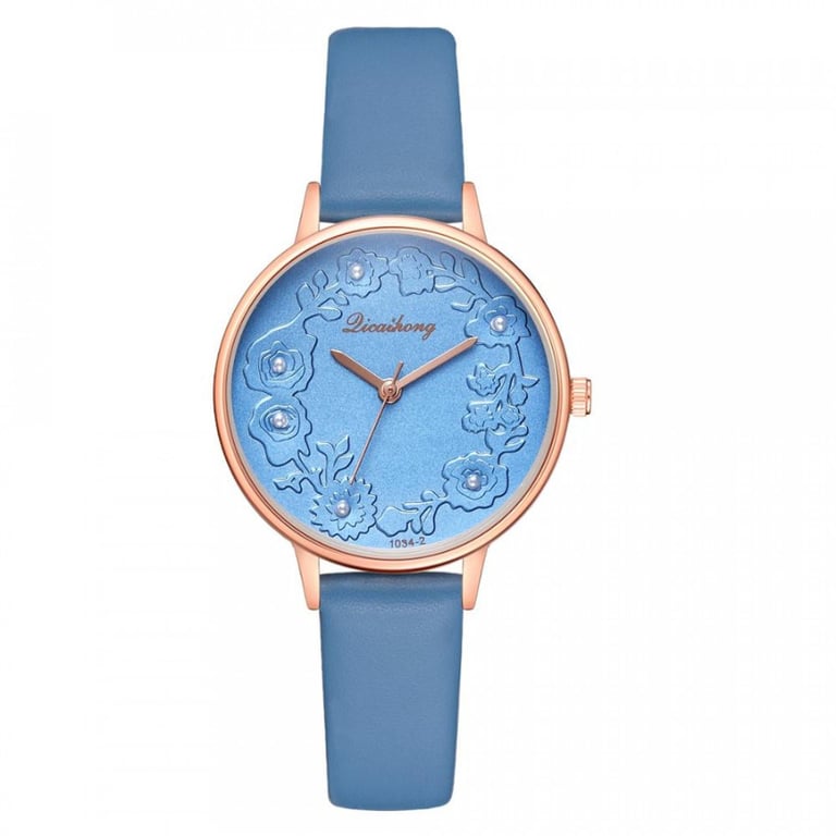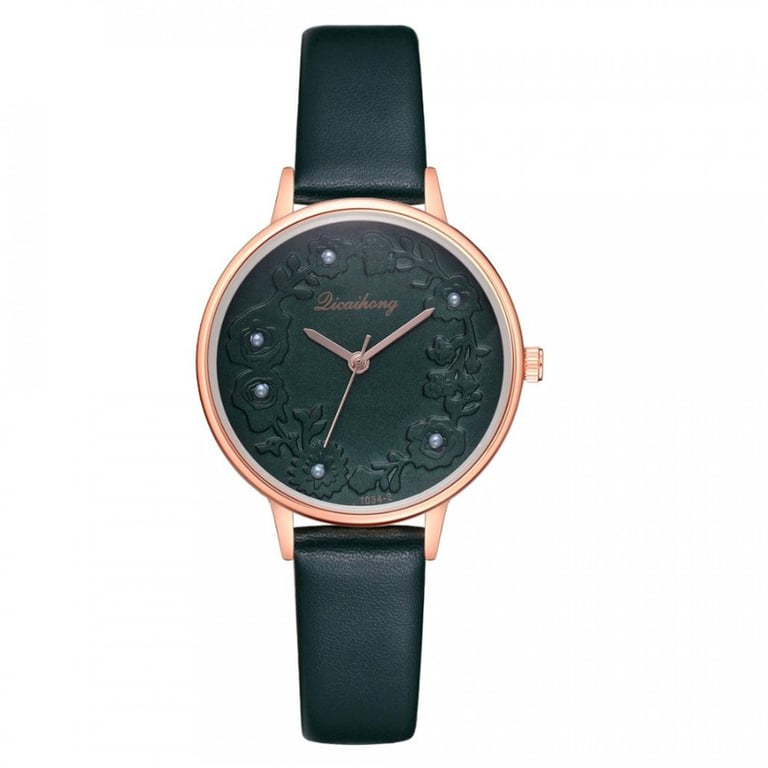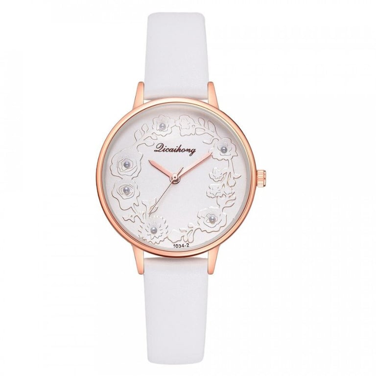 Women's watch with an adjustable faux leather strap. The dial in a metal frame is adorned with flowers.