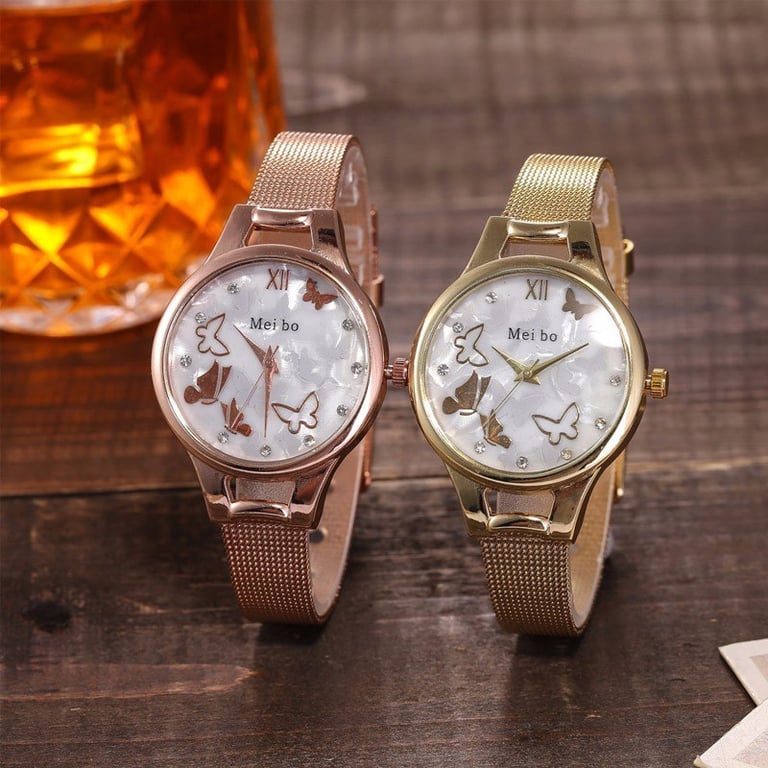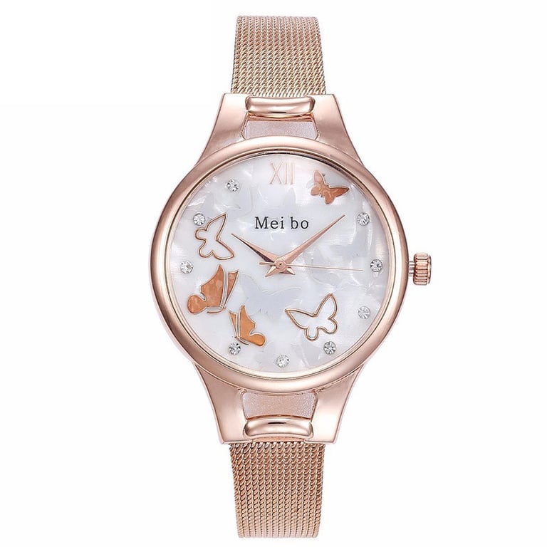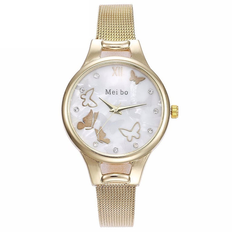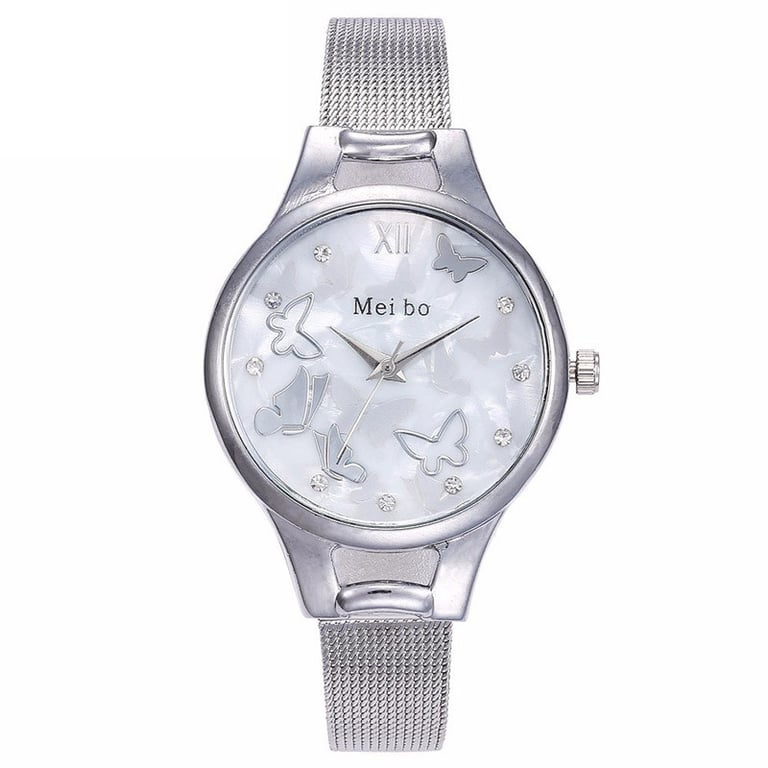 Women's watch with a white dial and adjustable strap. Unnumbered dial with butterflies and white sparkling stones. Available in three variants.