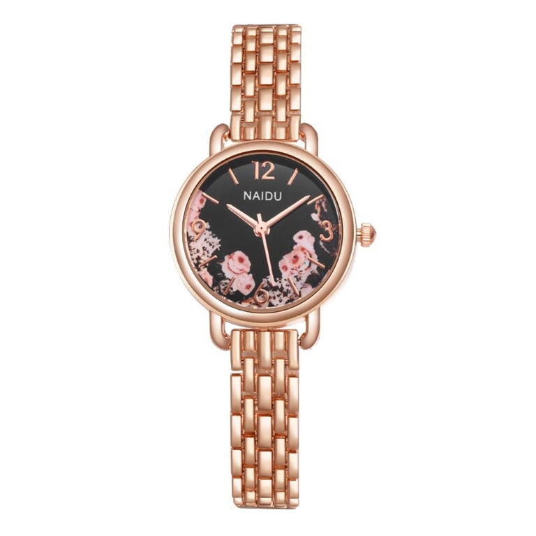 Women's watch with an adjustable metal strap. Dial with numbering in a metal frame and a floral motif.