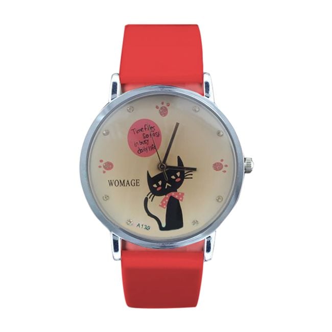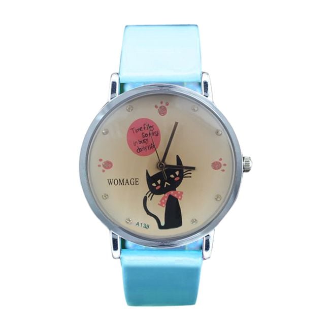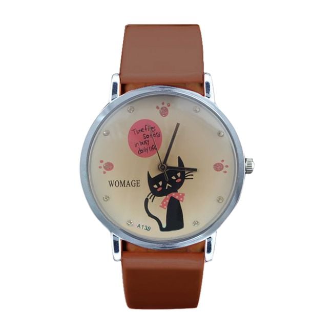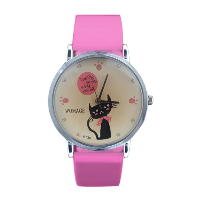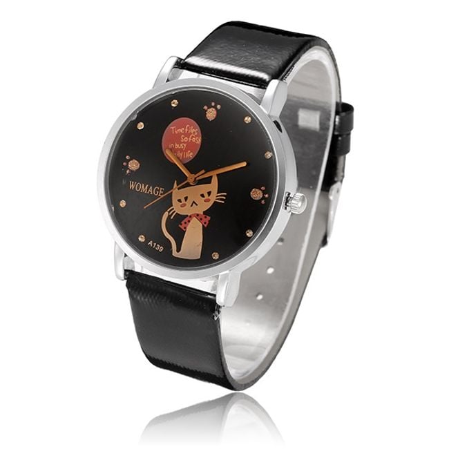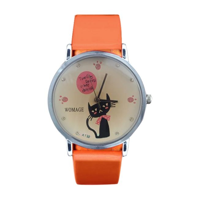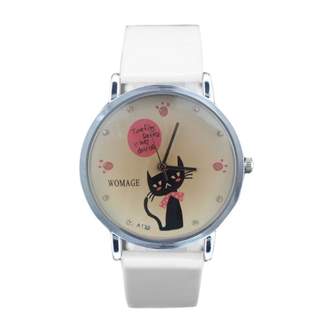 Women's watch with a cat on the dial will delight lovers of these adorable animals. On the dial, you will find one cat and tiny paw prints. The strap is made of synthetic leather and is available in several colours.