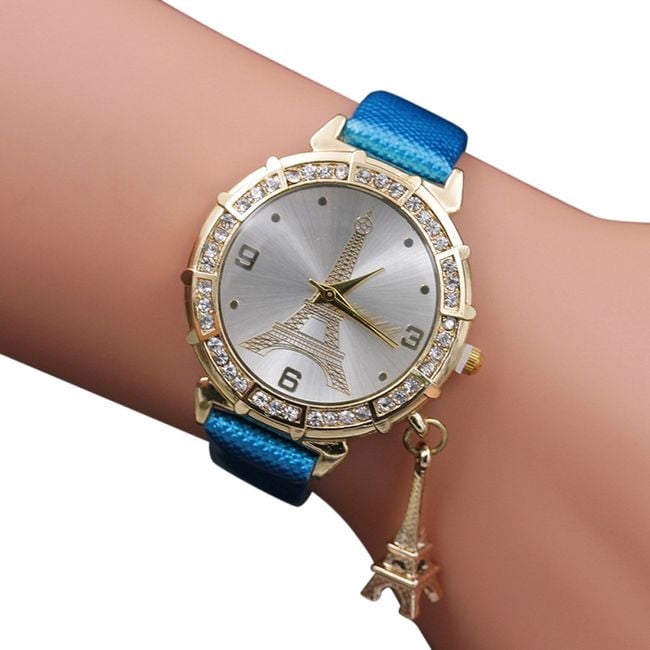 An attractive design featuring the Eiffel Tower and rhinestones adorns these ladies' wristwatches.