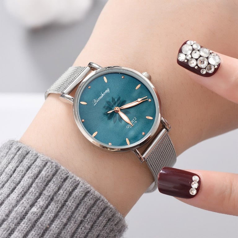 Women's watch in elegant silver design with a coloured dial. The dial is without numbers and is decorated with a subtle flower and gemstones. Adjustable strap. Available in several variants.