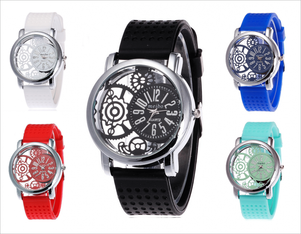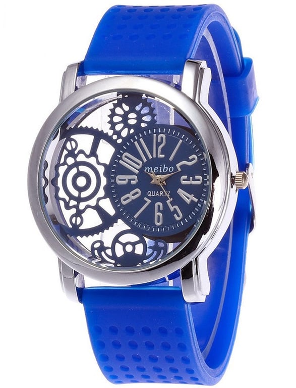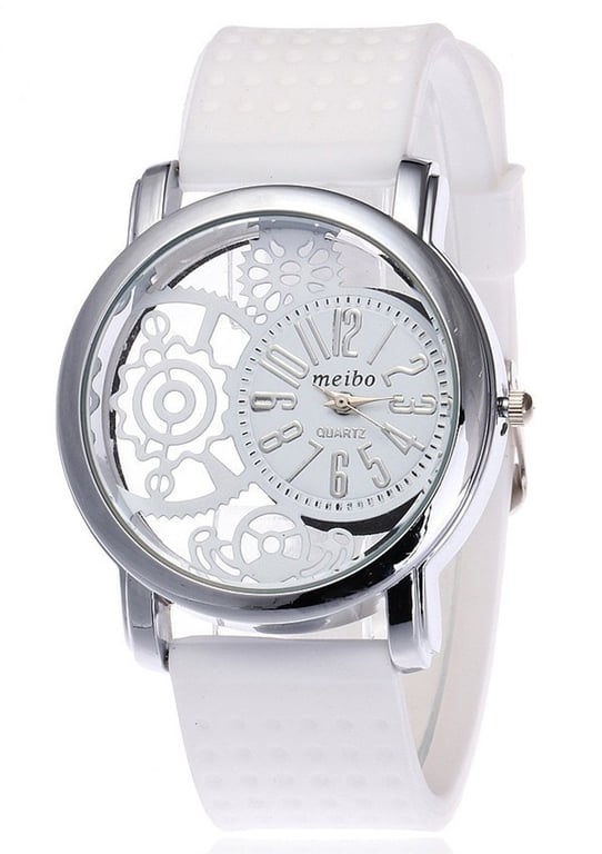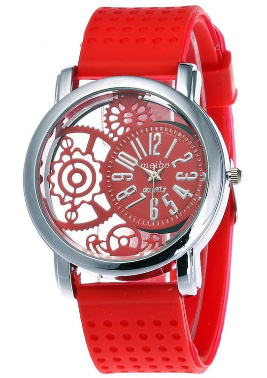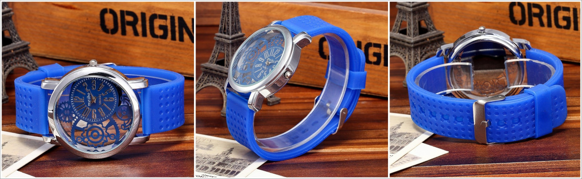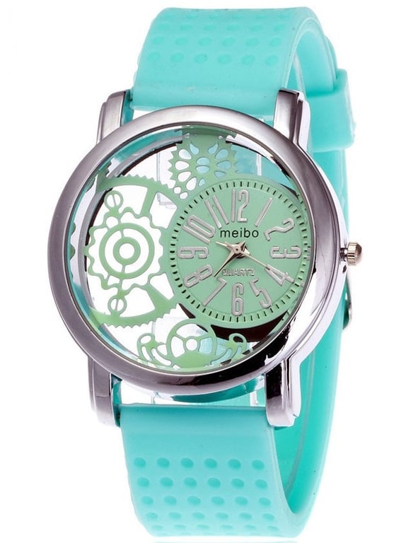 Modern women's watch with a transparent dial and silicone strap. **Product features:** - **Material:** silicone, stainless steel - **Colour:** white, red, blue, black, turquoise - **Dimensions:** * dial diameter – 3.2 cm * strap length – 20 cm * strap width – 1.5 cm - **Package contents:** 1 piece