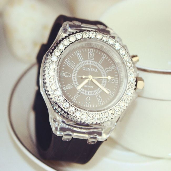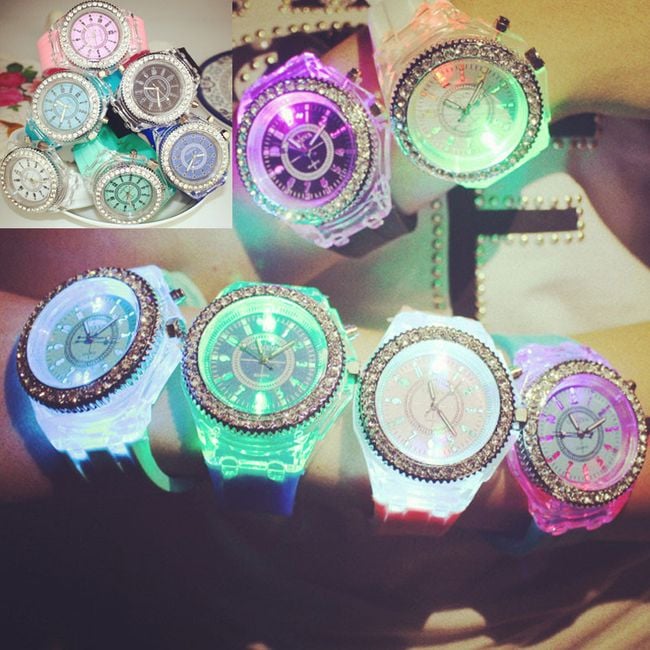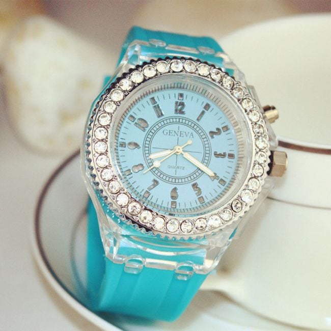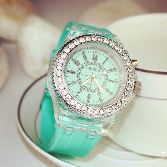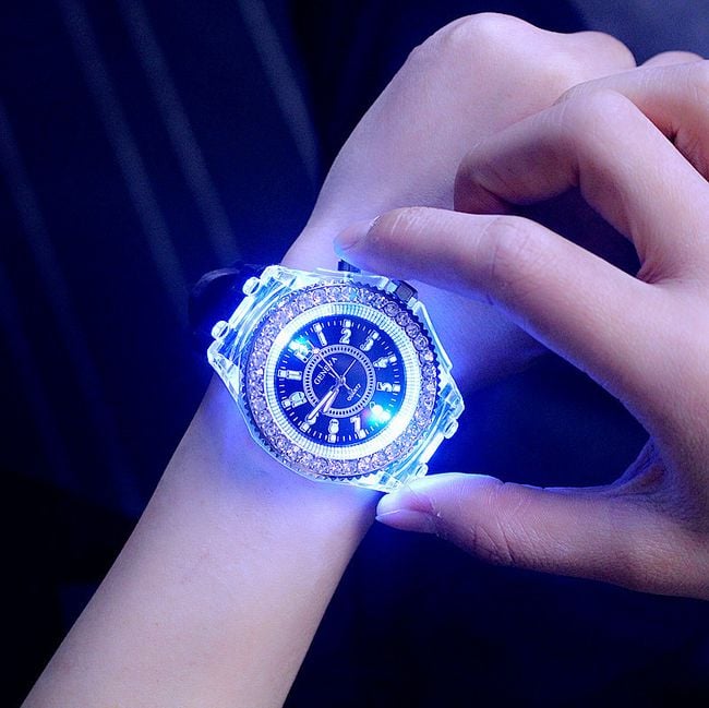 The sporty LED watch serves as a beautiful accessory for ladies. The silicone watch is adorned with a large dial featuring gemstones. By pressing the button on the side, you can illuminate it. Choose from 7 colour options.