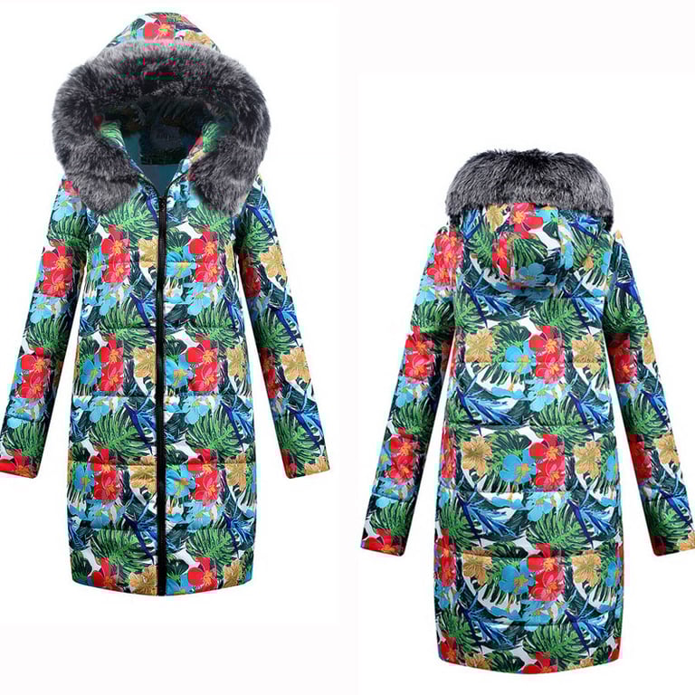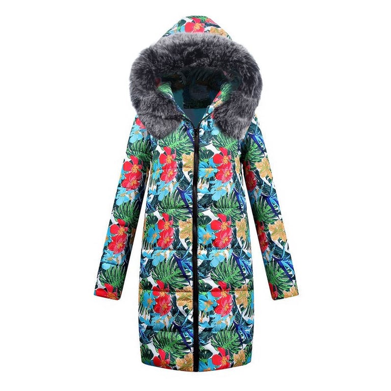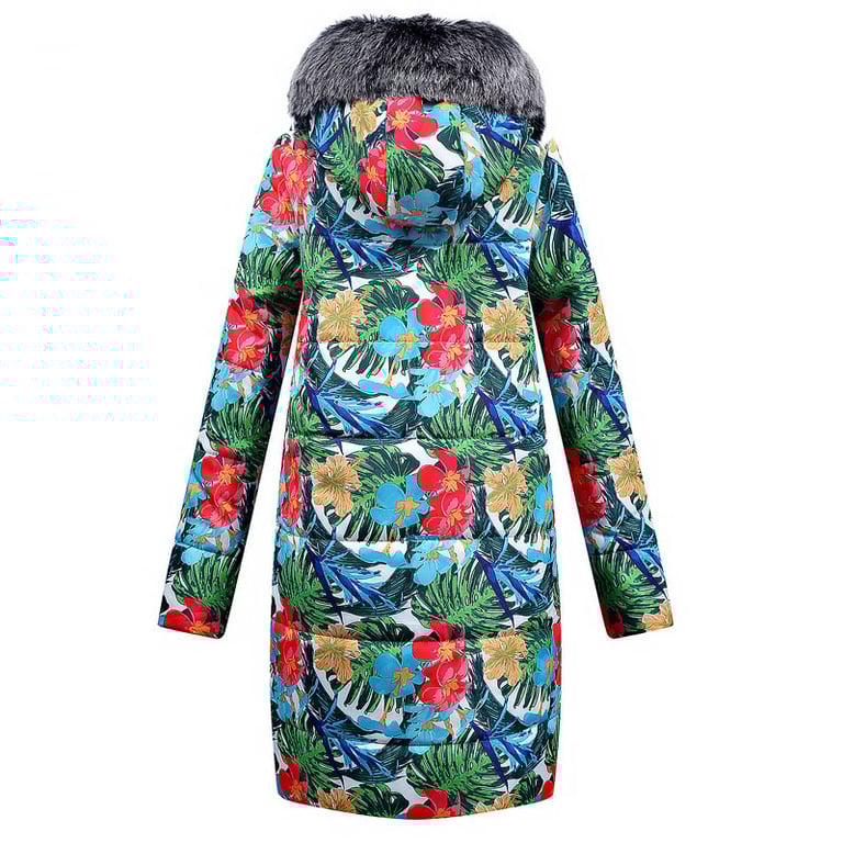 Women's long winter quilted coat. The coat features a hood with a large fluffy fur trim and a zip fastening. Available in three colour options.