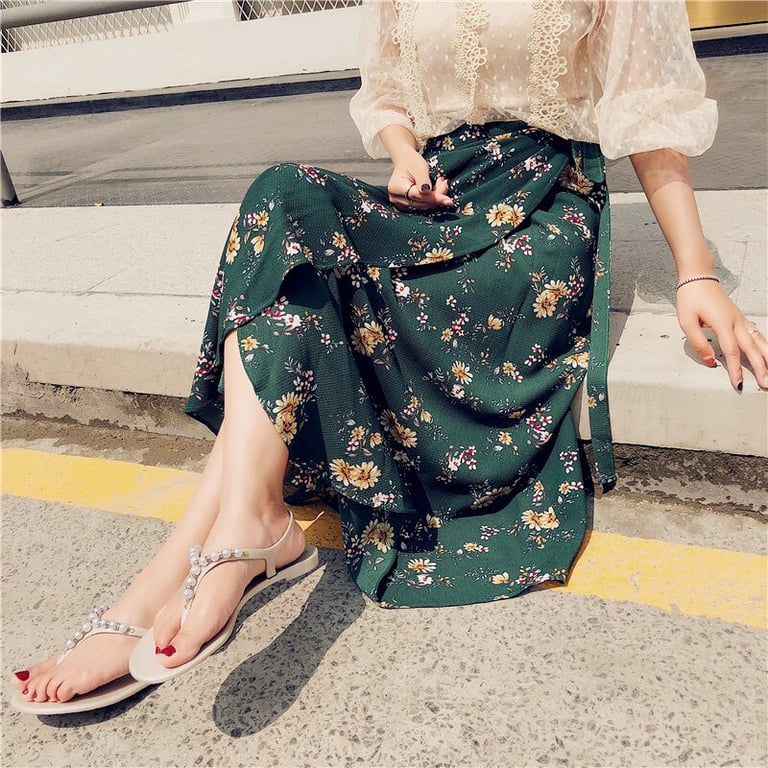 Women's long skirt with a colourful floral pattern. Wrap-around loose fit. One size. Available in multiple colour options.