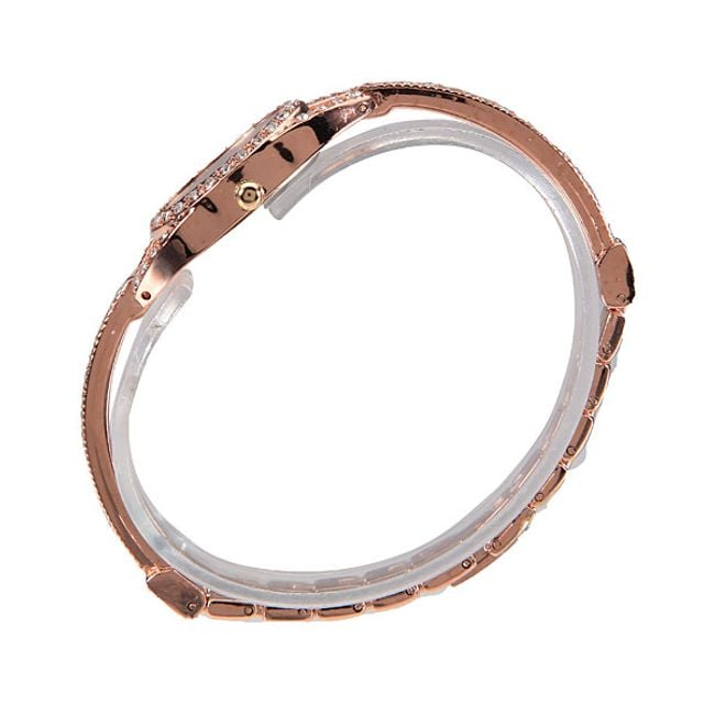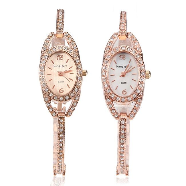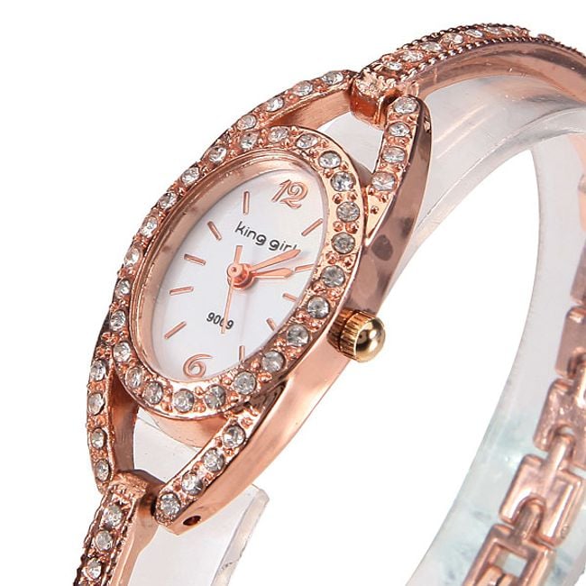 The gold-coloured wristwatch adorned with clear cut glass stones features an oval dial in gold or white. It is suitable for everyday wear as well as special occasions.