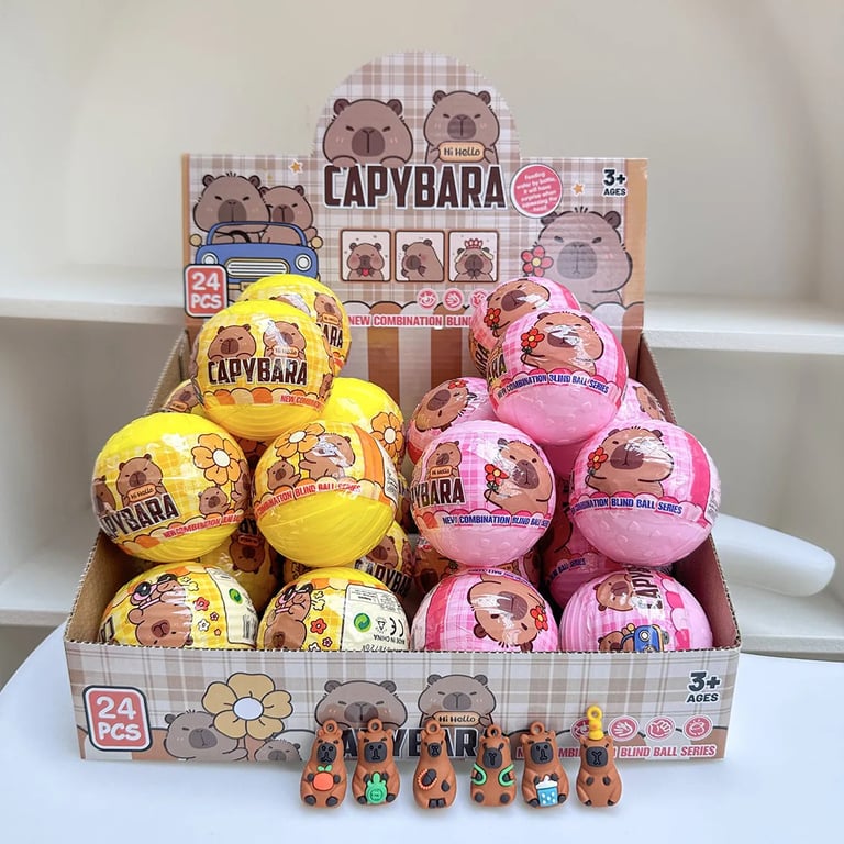 The Capybara Blind Box is an original collector’s set of 24 capsules full of cute capybara figures in various poses with floral motifs. Each pack hides a random magnetic figure. The colourful yellow and pink capsules will delight children and kawaii animal collectors.