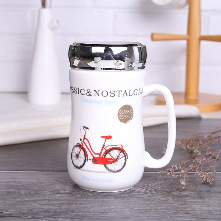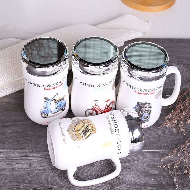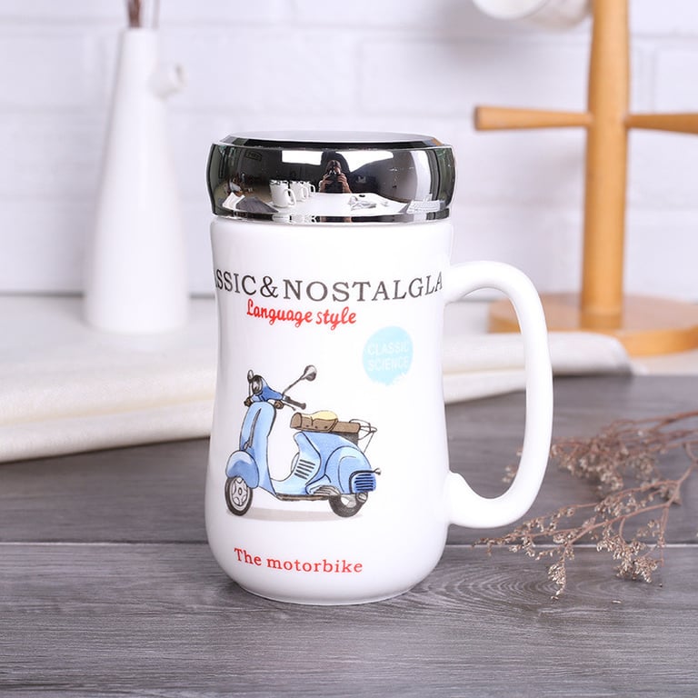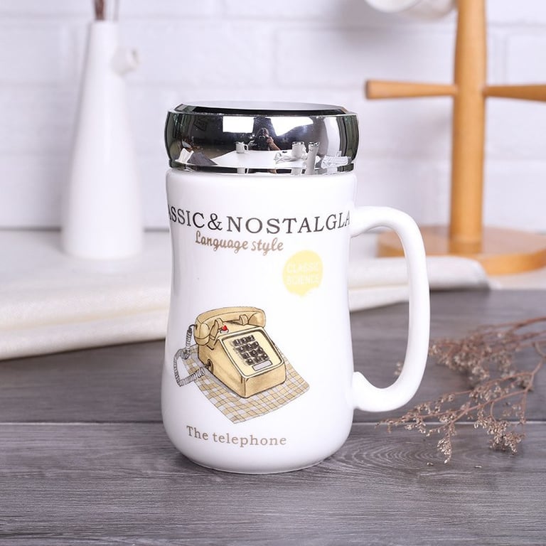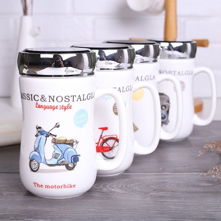 Designer mug with a large handle and a safety lid. Various options with retro designs available.