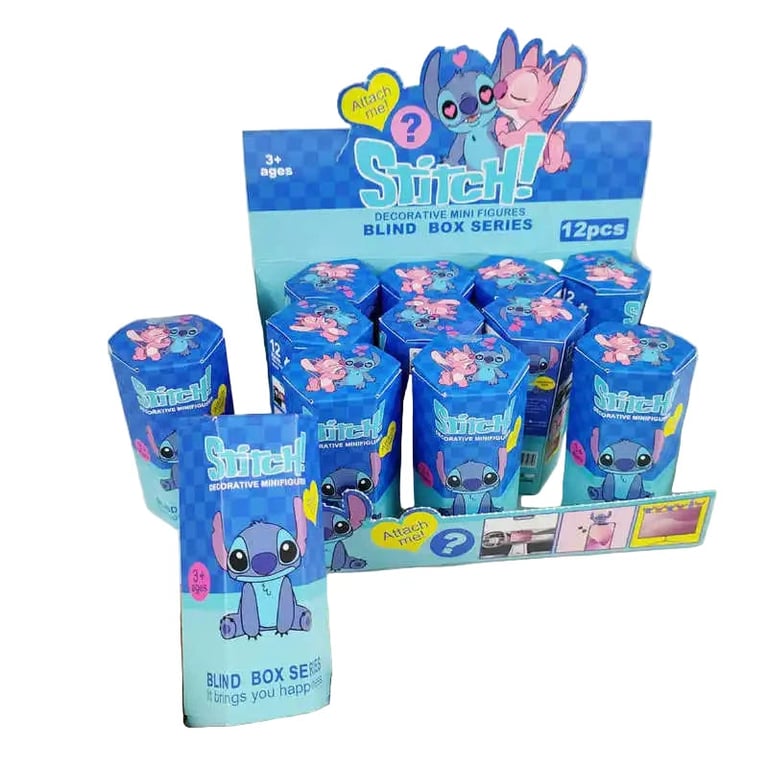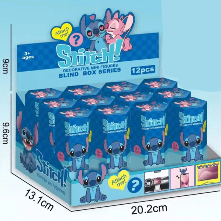 Stitch Blind Box brings a collection of 12 cute figurines featuring Stitch and Angel. Each pack hides a surprise – blue or pink Stitch in various poses, some with glasses or in party outfits. High-quality PVC construction withstands play and collecting, and the colourful boxes can be easily displayed or given as an original gift.