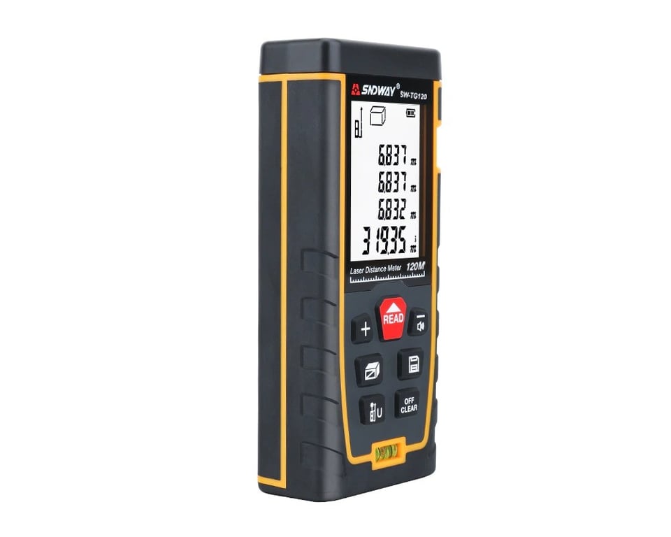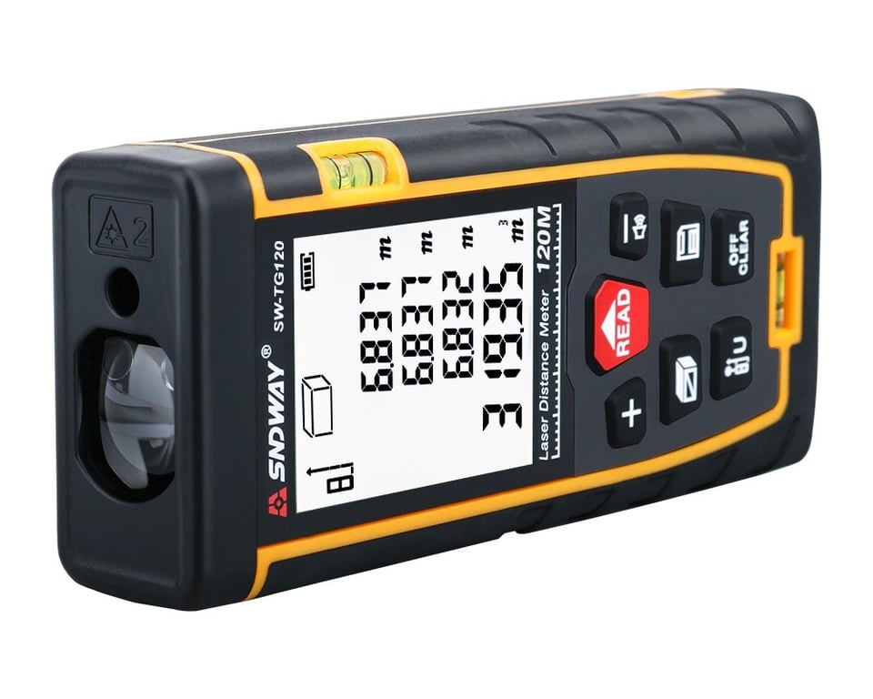 This laser rangefinder is ideal for calculating dimensions up to a distance of 120 m. It can also calculate area and volume using Pythagorean equations. Thanks to the built-in memory, it can recall up to 30 of the most recent measurements.