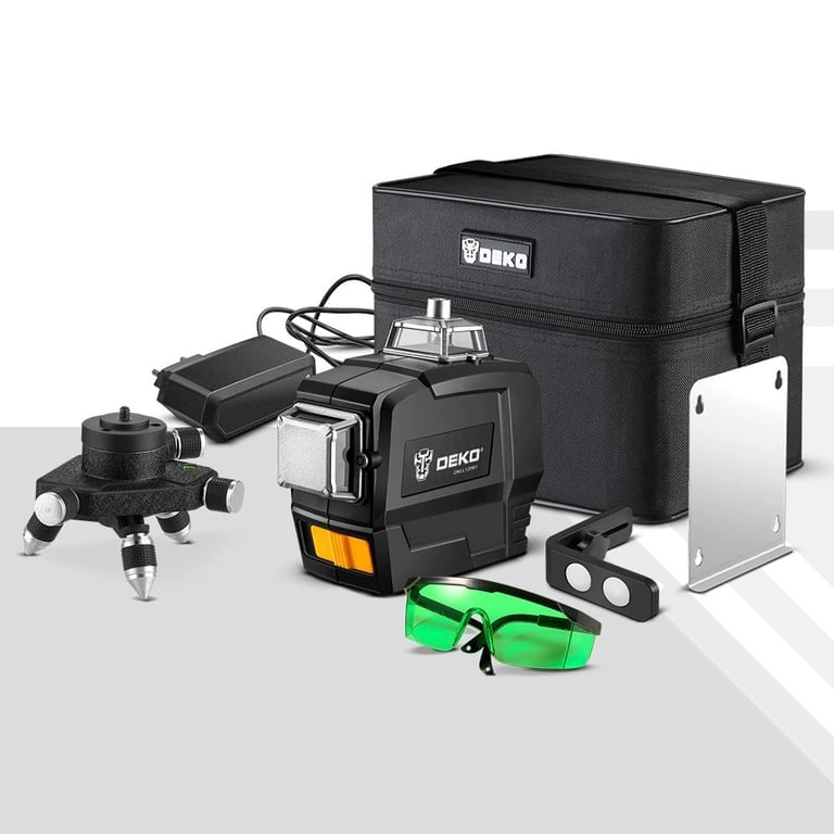Package contents: 1x laser level, 1x power adapter, 1x protective glasses, 1x bag, 1x stand, 1x wall mounting kit