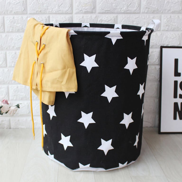 Laundry storage basket. Print with a star motif. Two handles for easy carrying.