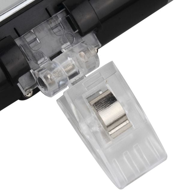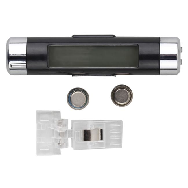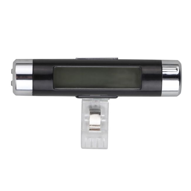 The clock with an LCD display and thermometer is a practical accessory for any car. It easily attaches to the air conditioning vents. The LCD display is blue backlit, allowing you to easily see the time even while driving at night.
