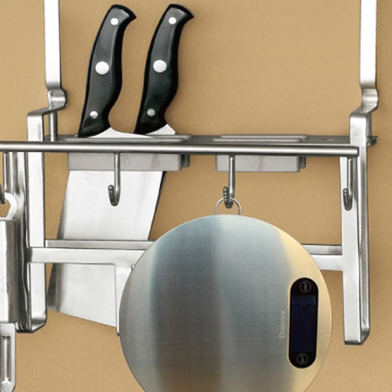 The kitchen scale features a slim stainless steel design with a hanging hook for easy storage in a hanging rack.