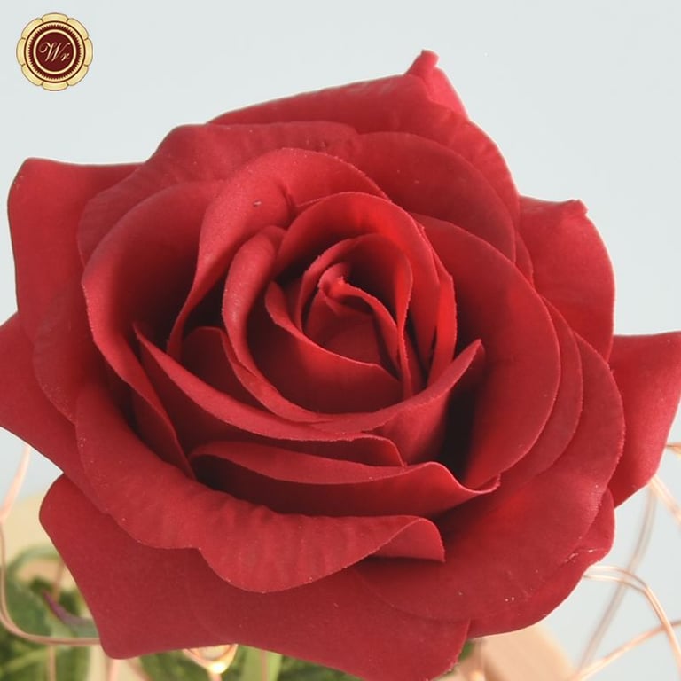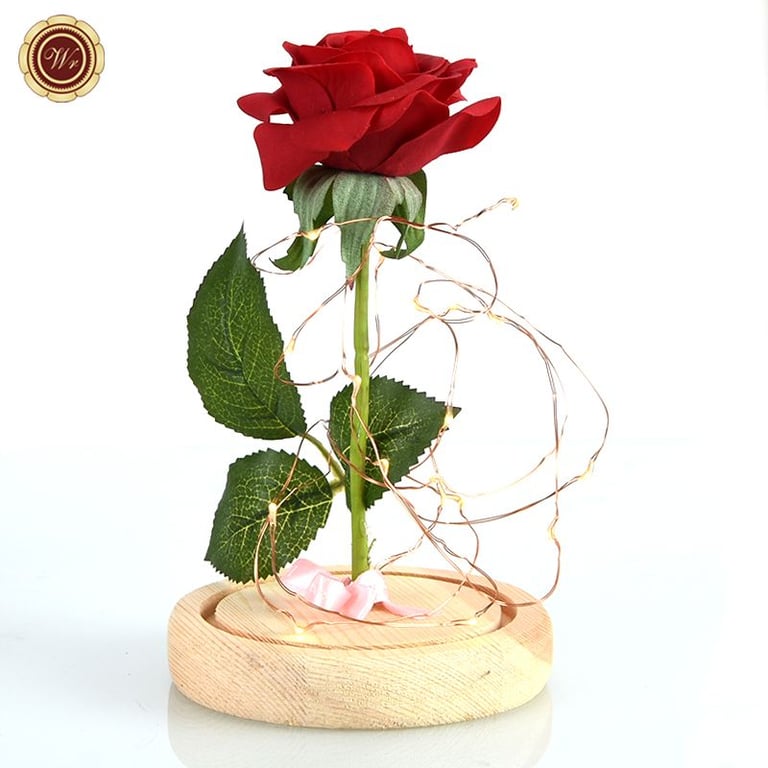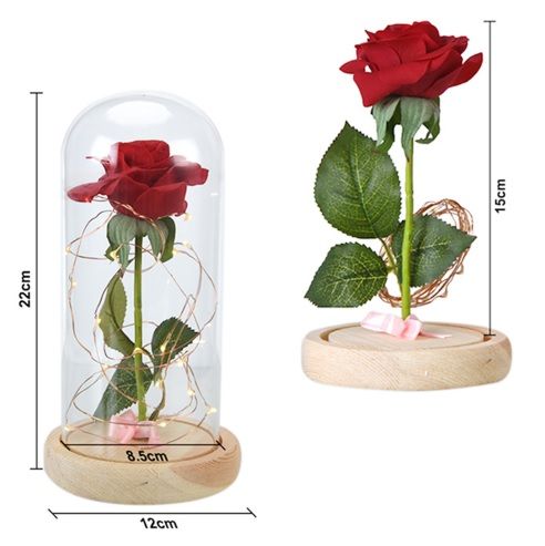 All thanks to the red rose with LED lighting in a glass box on a wooden base.
