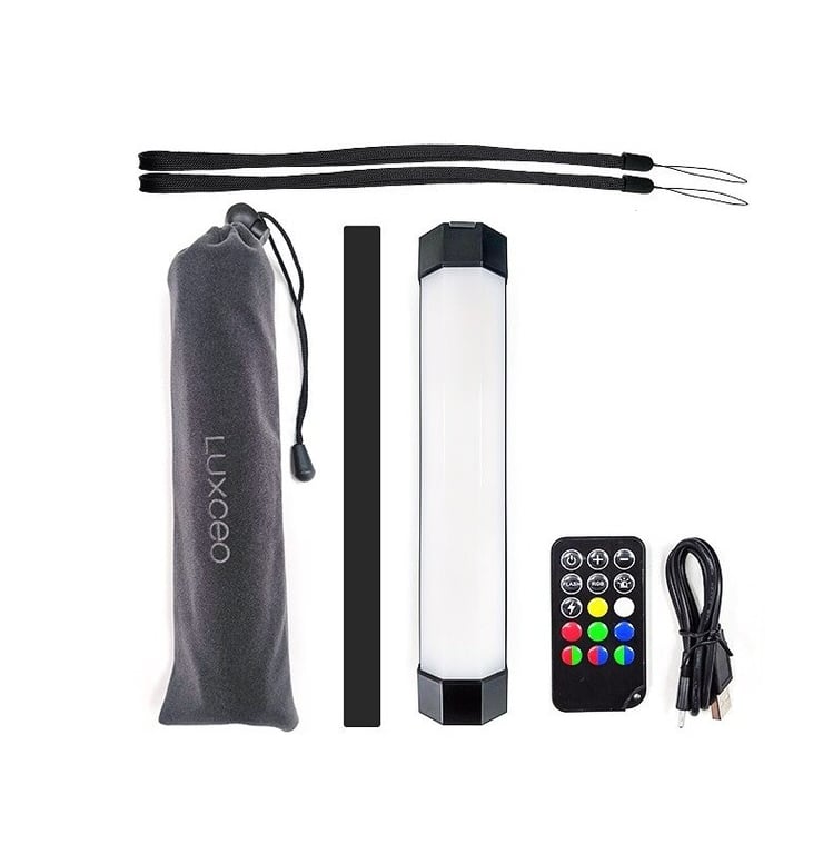 Package contents: 1x light, 1x charging cable, 1x remote control, 1x pole, 2x strap, 1x case