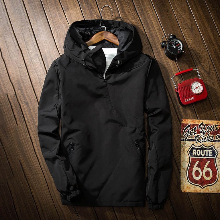 Men's pullover jacket with a hood and a comfortable fit.