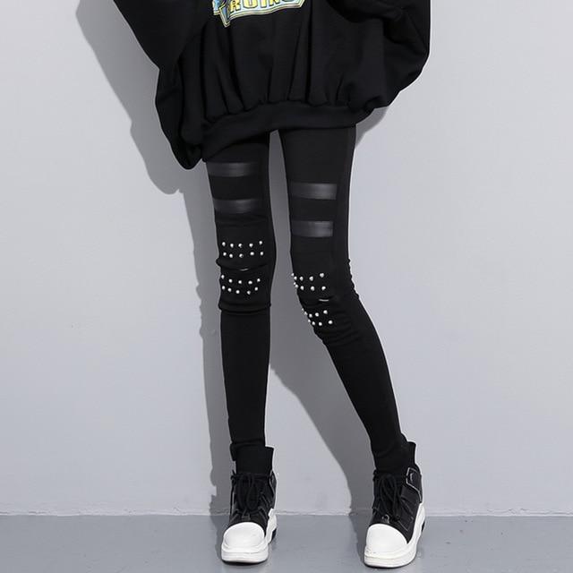 Stylish leggings made from elastic material and a body-hugging cut. The front features rows of spikes and strips of faux leather.