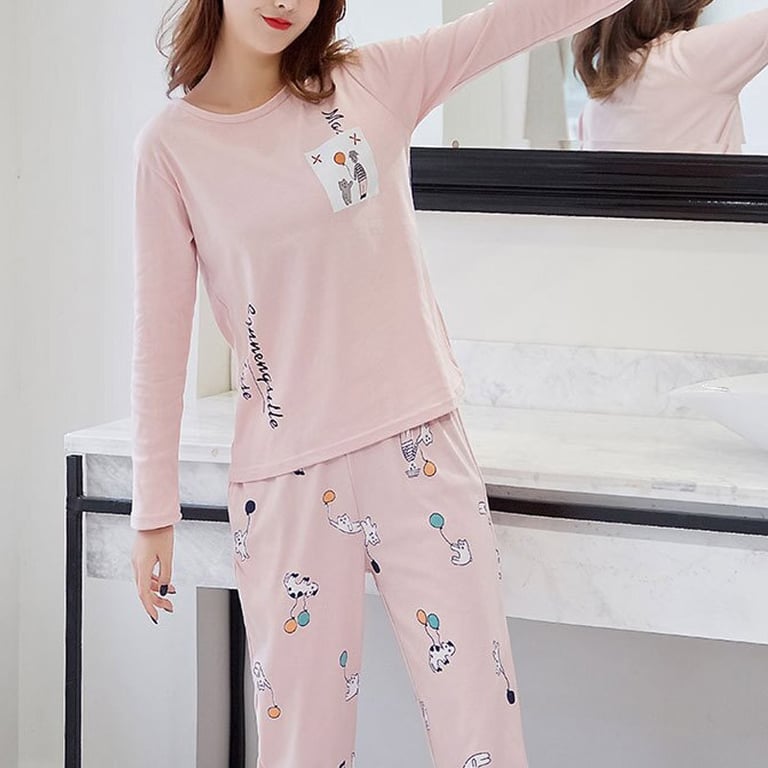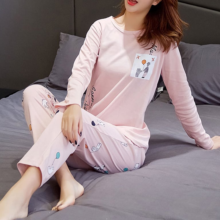Women's pyjamas with a colourful print. Long-sleeved top. Trousers with long legs and an elasticated waistband.