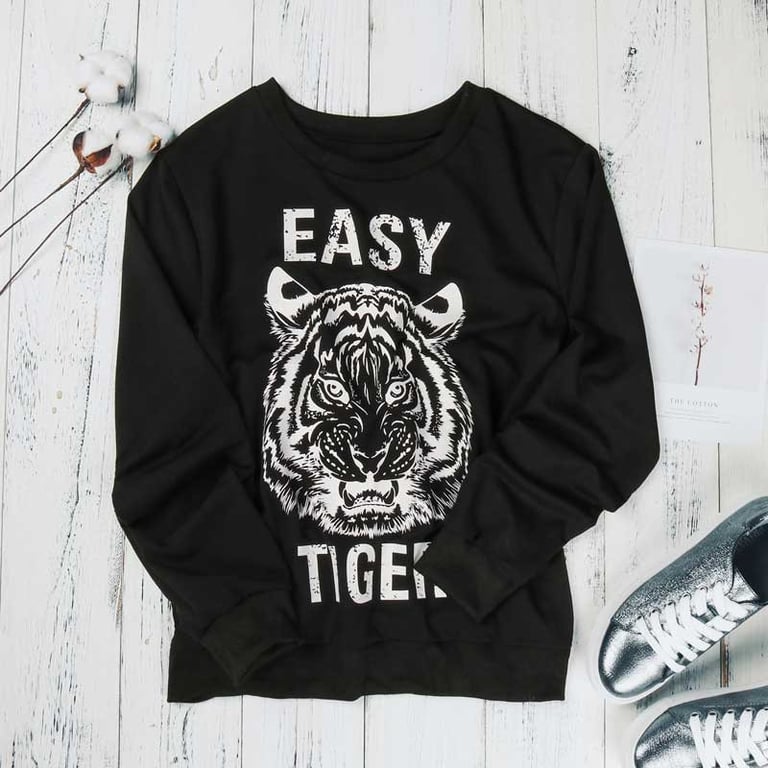Women's pullover sweatshirt with a round neckline and long sleeves. Loose oversized fit. Tiger motif print on the front. Available in two colour variants.