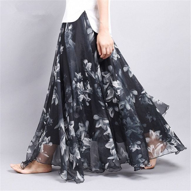 You will simply fall in love with this beautiful long skirt featuring various floral patterns. The skirt is made from a pleasant and airy material, ideal for spring and summer. The interesting design concept and nice cut will flatter almost any female figure.